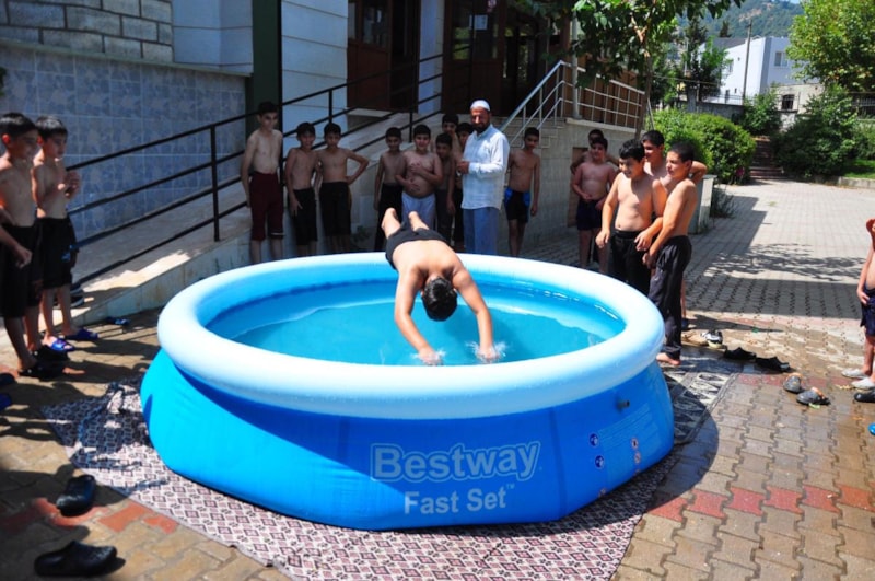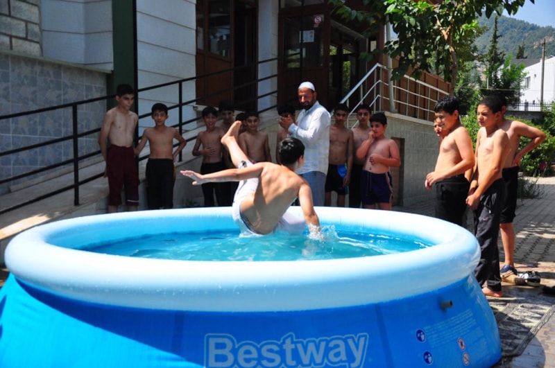 Yaz Kur'an kursuna katılan 110 öğrenci, öğle saatlerinde derslerini tamamladıktan sonra sırayla havuza girerek hem serinliyor hem de eğlenceli vakit geçiriyor.