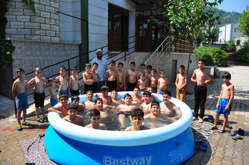 Turgut Özal Mahallesi'nde görev yapan Hacı Mahir Camisi’nin imamı Bünyamin Baysal, mahallede yüzme havuzu ya da denize ulaşım imkanı olmayan çocukların, yaz Kur'an kursu sonrası güvenli şekilde serinleyebilmeleri amacıyla cami bahçesine şişme havuz yerleştirildi.