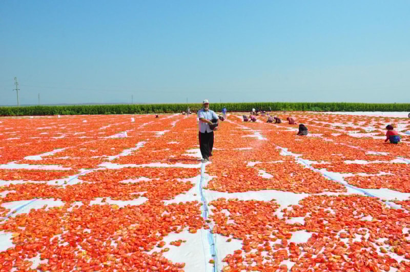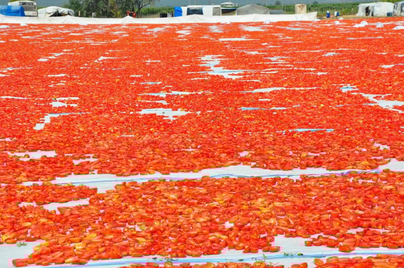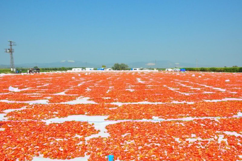 Manisa'da hasat edilen domatesler, kurutulmak için tarlalara serilirken, Gediz Ovası da kırmızıya büründü. Kurutulan domatesler ABD, Avustralya ve Avrupa ülkeleri dahil toplam 34 ülkeye ihraç edilecek.