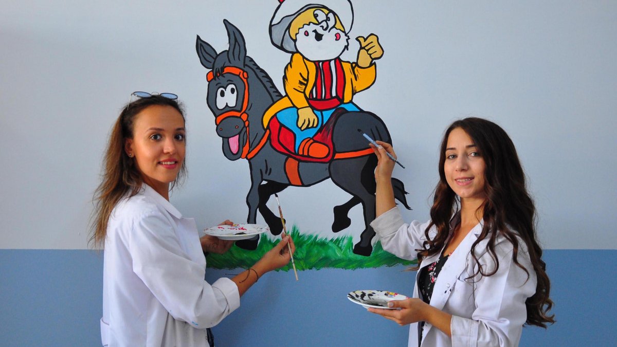 Koronavirüs nedeniyle okullarından uzak kalan ve okula dönmeye hazırlanan öğrencilerini mutlu etmek isteyen öğretmenler, okulun iç duvarlarına Türk masal kahramanlarını ve çizgi film karakterlerinin resimlerini çizdi.