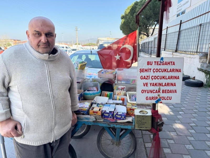 Manisa'nın Soma ilçesinde 10 yıldır seyyar oyuncak satan Cevdet Demirkan, bir şehit çocuğunun çamurda tahta arabasıyla oynamasından etkilenmesinin ardından şehit ve gazi çocuklarına bedava oyuncak dağıtarak onlara moral veriyor.