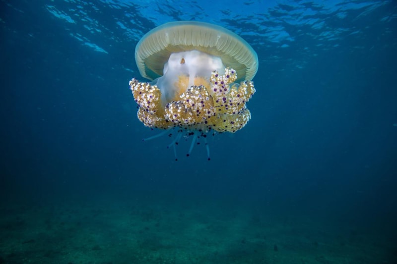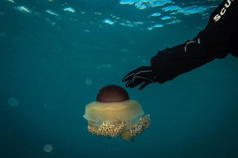 Dalış sırasında, Marmara Denizi’nde ilk kez 2022’de görülen ve zehirsiz tür olarak bilinen “maviş denizanası” (Cotylorhiza tuberculata) da görüntülendi.