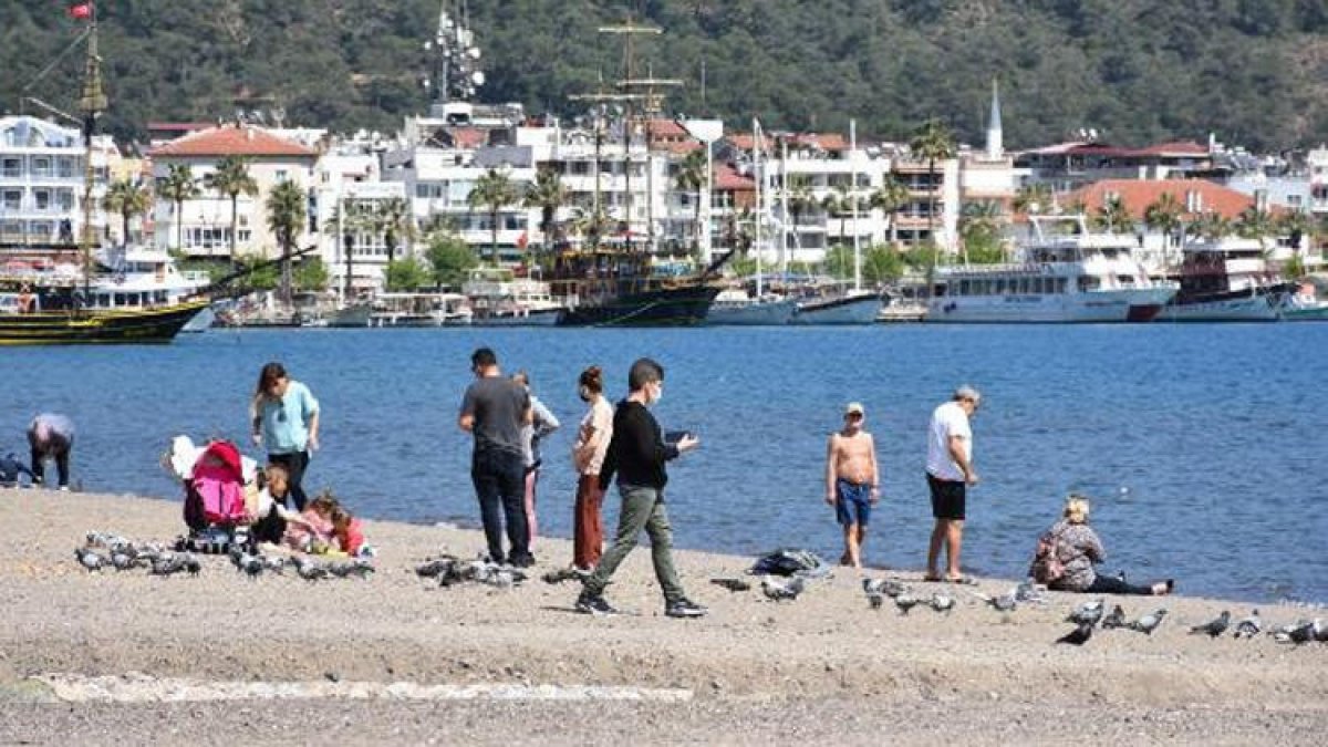 Büyük şehirlerden kaçanların akın ettiği Marmaris'te sahiller doldu taştı.