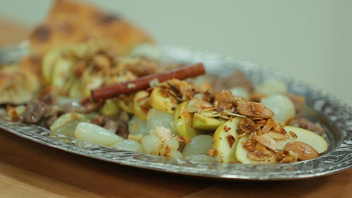 Kuşbaşı şeklinde kesilmiş kuzu etini bir tencereye koyarak, üzerini kaplayacak kadar su koyun. Suyunu çekene kadar kuşbaşını pişirin. Bir su bardağı ılık su içinde balı ve nar ekşisini iyice karıştırın. Etlere tuz ve karışımı ilave edin ardından kapağı kapalı bir şekilde, kısık ateşte pişirin. Yemeğin suyu azaldıkça su ilave edin. Kıymayı tuz ile küçük köfte yapın ve et pişince içine köfteleri, kayısıyı, bademi ve eriği atın. Ardından pişmeye bırakın. Meyveler yumuşayınca elmaları ilave edin. Yemek pişmeye başlayınca, bir bardak içinde su ile nişastayı çözün. Ardından gül suyunu ilave edin ve yemeğin üzerine dökün.