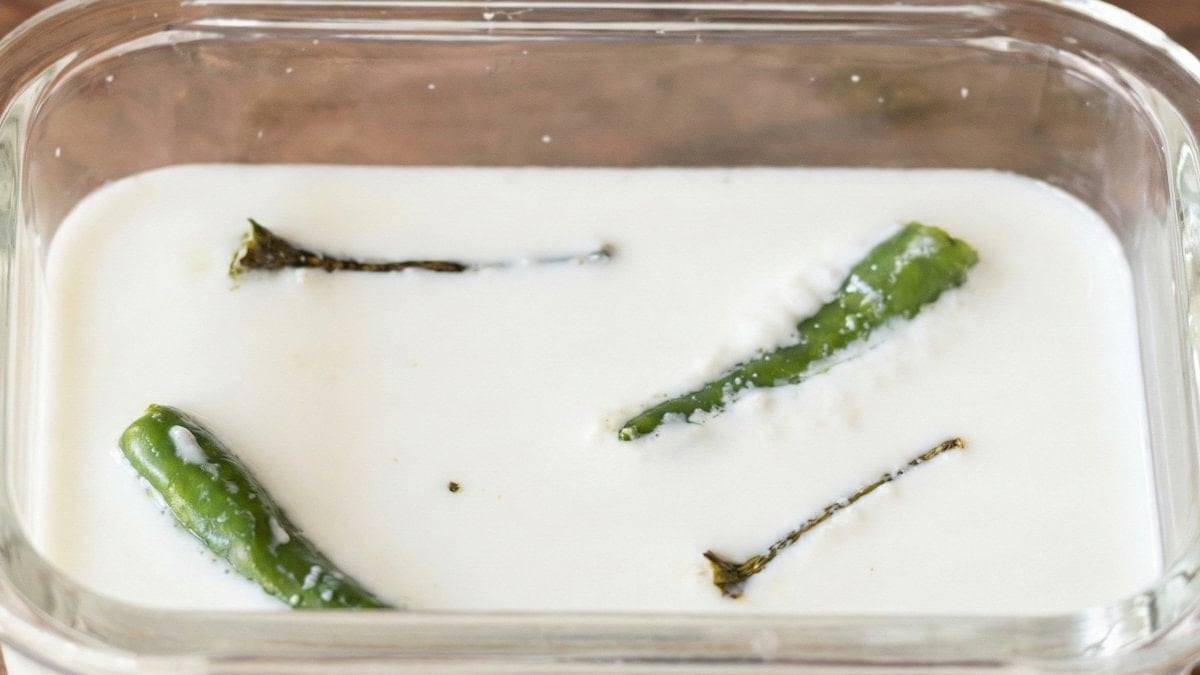 Geniş cam bir kabın içine saplarıyla birlikte iki tatlı yeşil biber koyun. Üzerine bir litre ılık sütü dökün.