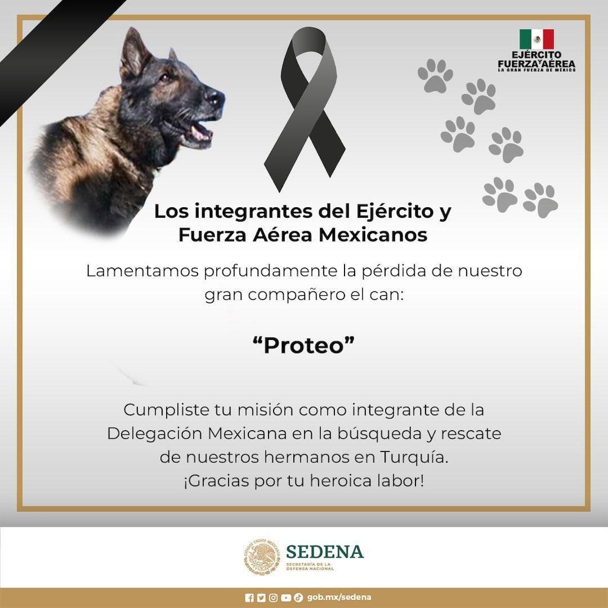 Meksika Milli Savunma Bakanlığı (SEDENA) tarafından yapılan açıklamada, “Meksika Ordusu ve Hava Kuvvetleri mensupları olarak büyük yoldaşımız Proteo adlı köpeği kaybetmenin derin üzüntüsünü yaşıyoruz. Türkiye’deki kardeşlerimiz için yürüttüğümüz arama-kurtarma çalışmalarında Meksika ekibinin bir parçası olarak görevini yerine getirdin. Kahramanca çalışmaların için teşekkür ederiz.” denildi.