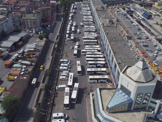 Tatil dönüşü yaşanan insan ve otobüs yoğunluğu, drone ile havadan görüntülendi.