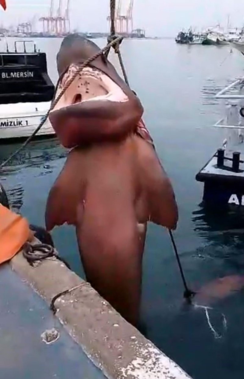 Köpek balığı vinç yardımı ile denizden çıkarılırken, gömüleceği bildirildi.