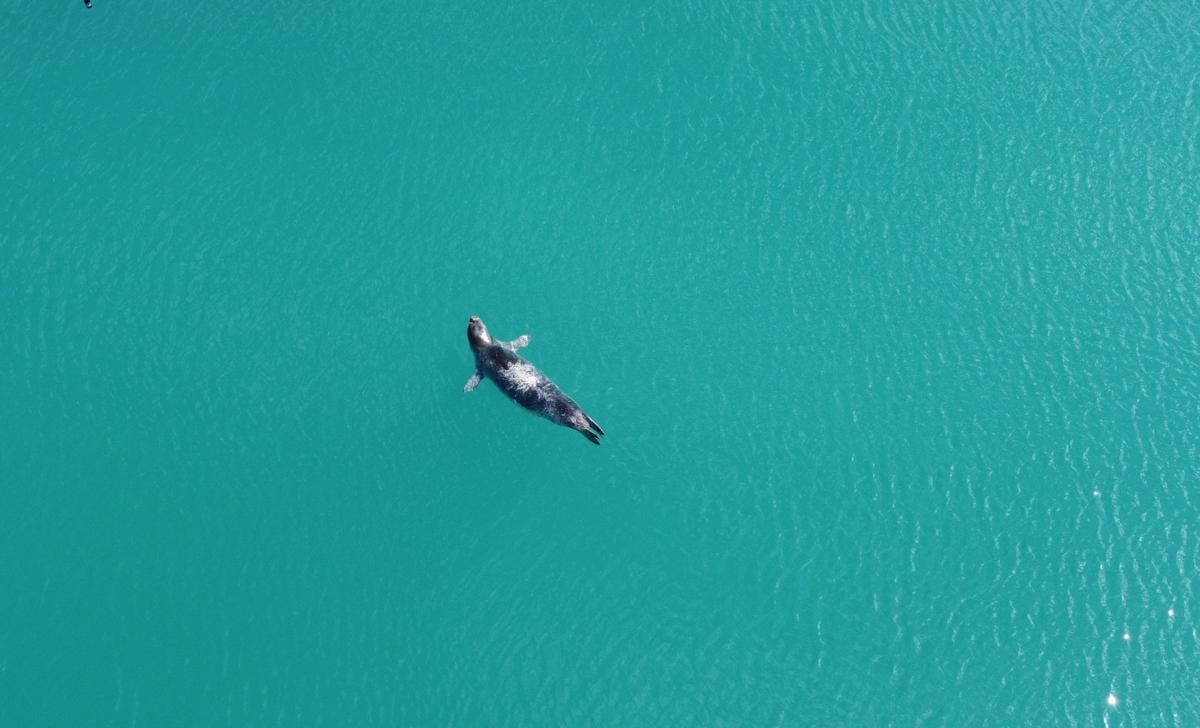 Sabah saatlerinde barınağa gelen ve 2 metreden fazla uzunluğu olduğu gözlenen fok, önce denizin ortasında bir süre güneşlendi.