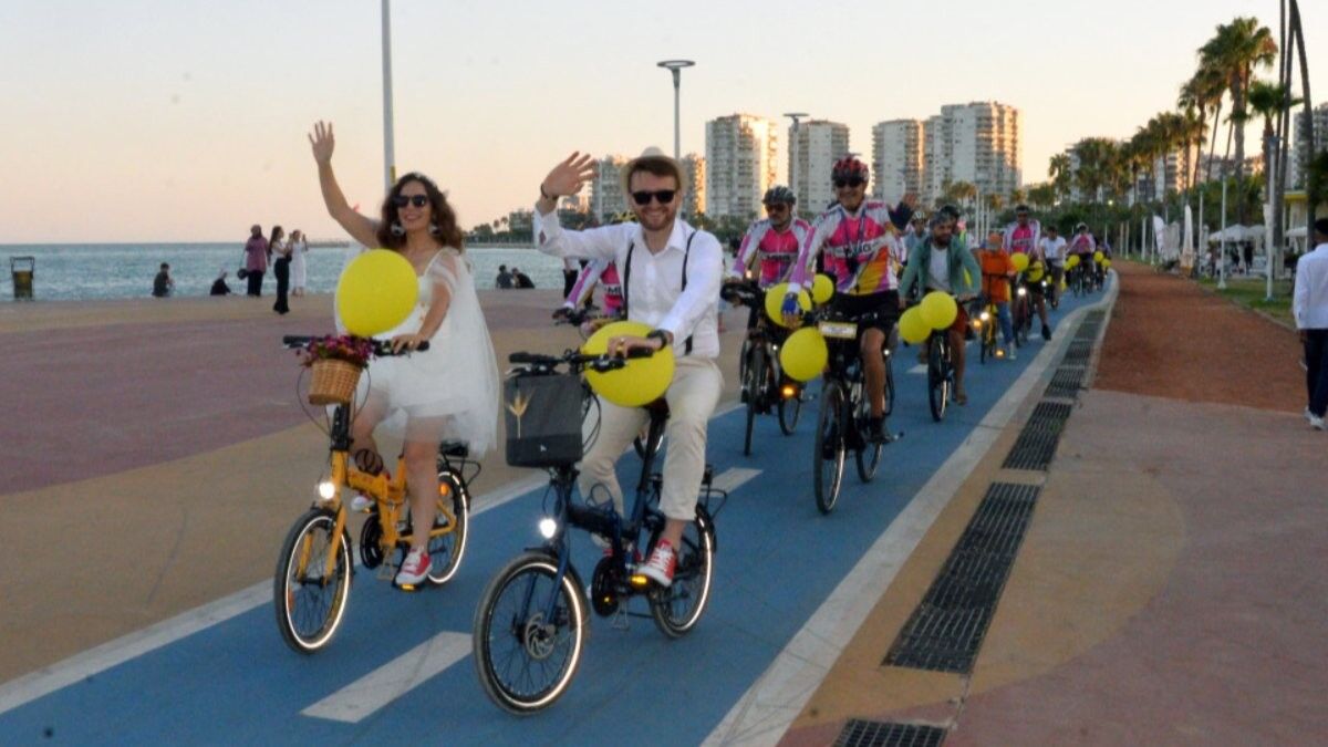 Serap Özçelik ve Sabri Yurdakul çifti, bisikletlerini gelin aracı olarak kullandı ve balonlarla süslenen bisikletlerle şehir turu atıldı.