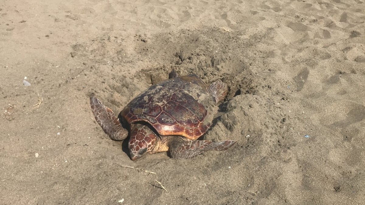 Genellikle sahile gece saatlerinde çıkarak yumurta bırakan caretta carettalardan biri, Mersin’de bu durumun dışına çıkarak gündüz saat 15.00 civarında yuvalama yaptı.