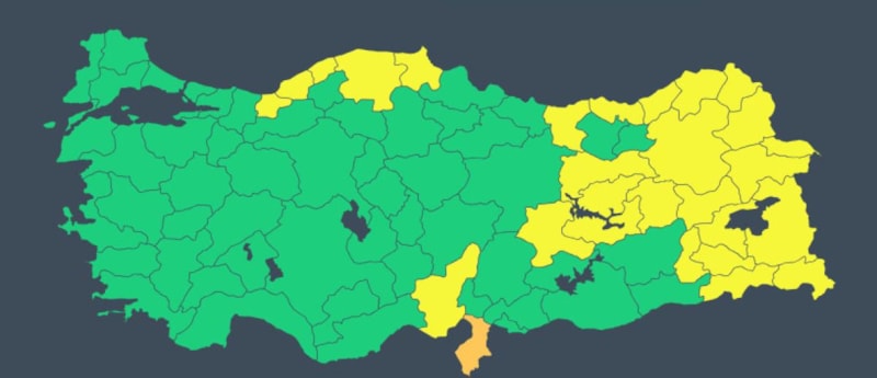 Sadece Hatay turuncu kodla uyarılırken, sarı kodla uyarılan 27 il ise şu şekilde sıralandı;