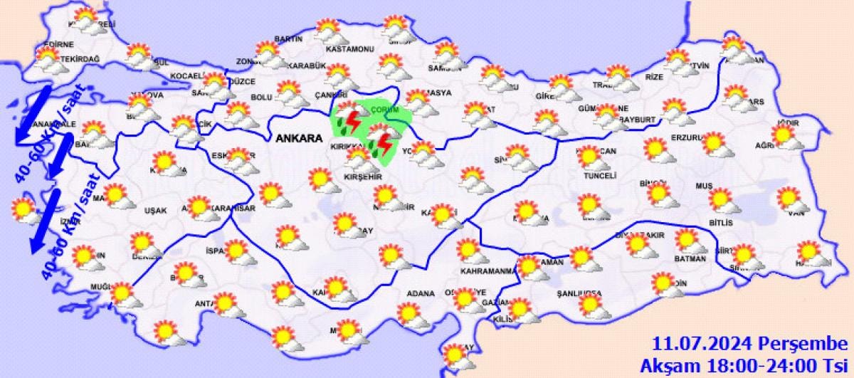 Yağışların; Kastamonu, Çorum, Çankırı, İstanbul çevreleri ile Kırıkkale'nin kuzey kesimleri ve Ankara'nın kuzey ve doğusunda yerel kuvvetli yerel kuvvetli olması bekleniyor. Yerel kuvvetli olması beklendiğinden yaşanabilecek olumsuzluklara karşı dikkatli ve tedbirli olunmalıdır.