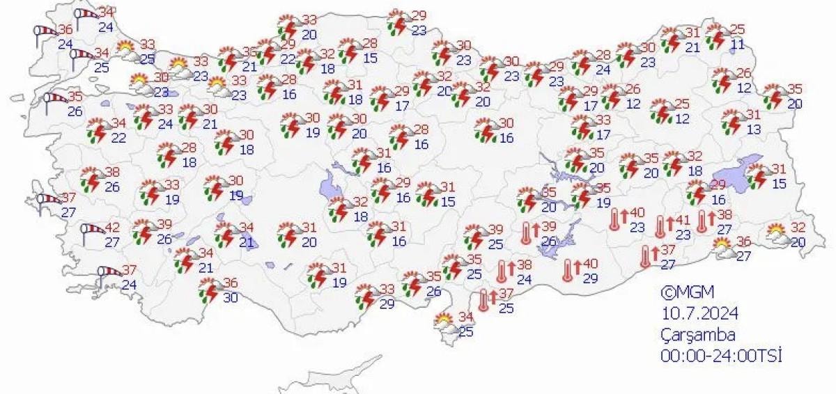 Akdeniz’in Toroslar kesimi, İç Anadolu’nun kuzey ve doğusu, Batı Karadeniz’in iç kesimleri, Orta ve Doğu Karadeniz, Doğu Anadolu (Hakkari ve Şırnak dışında) ile Bursa ve Bilecik çevrelerinin yerel olmak üzere sağanak ve gök gürültülü sağanak yağışlı geçeceği tahmin ediliyor.