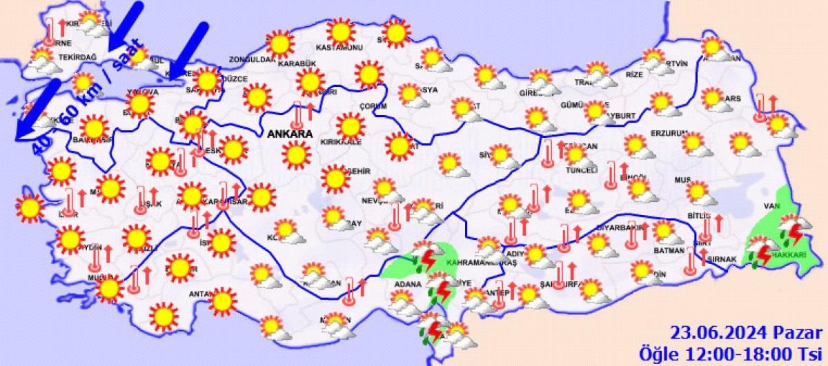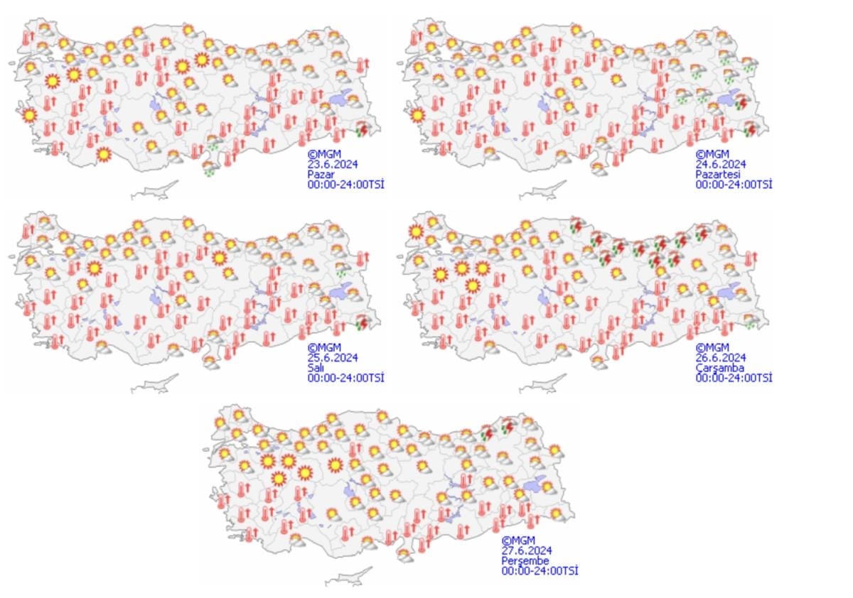 Yeni haftada günün en yüksek sıcaklık değerleri Ankara'da 37, İstanbul'da 31, İzmir'de 36, Adana'da 35, Diyarbakır'da 42, Antalya'da 30, Samsun'da 29 derece civarında seyredecek.