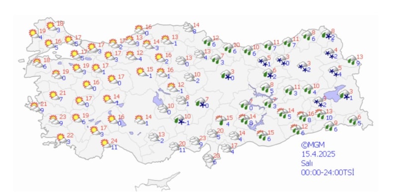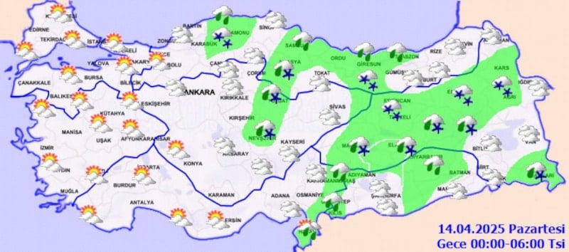 Parçalı ve çok bulutlu, Orta Karadeniz, Giresun Trabzon çevrelerinin aralıklı yağışlı geçeceği tahmin ediliyor. Yağışların, kıyı kesimlerinde yağmur ve sağanak, iç kesimlerinde karla karışık yağmur ve kar şeklinde olması bekleniyor.