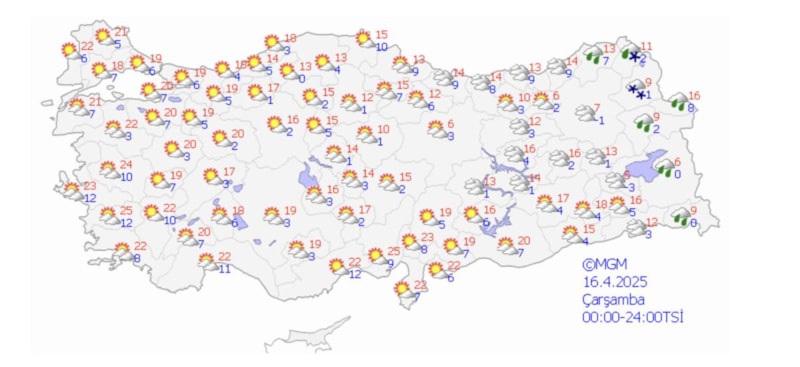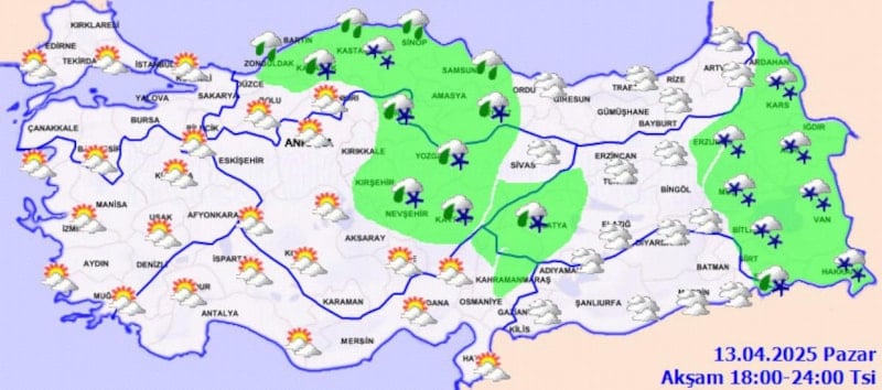 İç Anadolu (Konya ve Eskişehir hariç), Batı ve Orta Karadeniz, Doğu Anadolu, Güneydoğu Anadolu’nun kuzey ve doğusu ile Sakarya, Giresun, Trabzon, Antalya’nın doğu ilçeleri, Hatay, Kahramanmaraş, Gaziantep ve Kilis çevreleri ve Osmaniye’nin doğu kesimleri yağışlı geçecek.