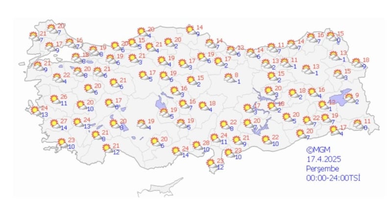 Bazı illerde beklenen hava durumuyla günün en yüksek sıcaklıkları ise şöyle: