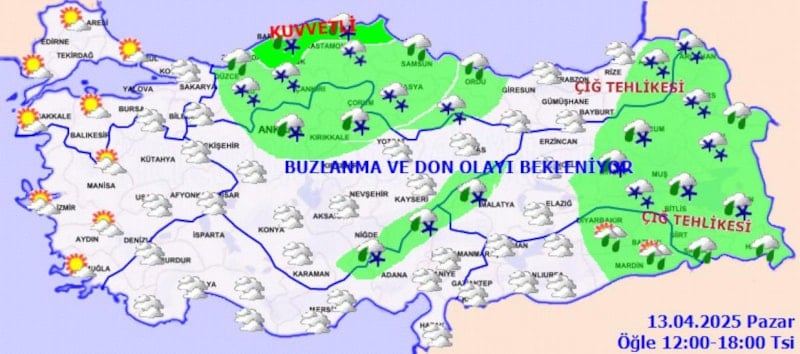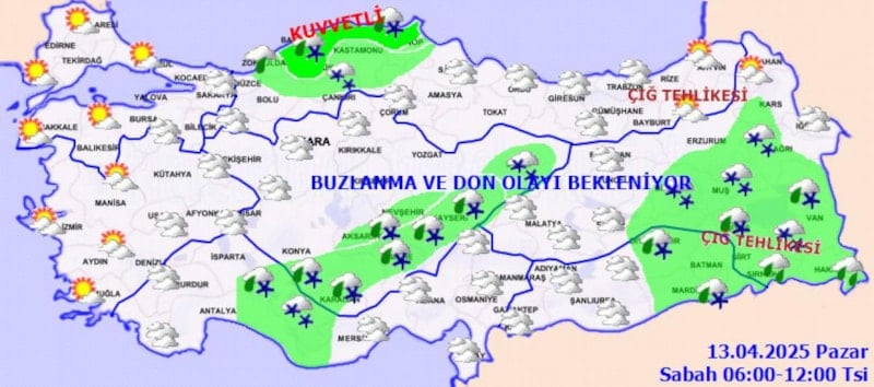Sabah ve gece saatlerinde Marmara’nın güney ve doğusu, İç Anadolu, İç Ege, Göller Yöresi, Karadeniz’in iç kesimleri ile Doğu Anadolu’da zirai don hadisesi beklendiğinden tarımsal faaliyetlerle uğraşan vatandaşların, Meteoroloji Genel Müdürlüğü tarafından il ve ilçelere yönelik hazırlanan sıcaklık tahminlerini dikkatle takip etmeleri ve zirai don riskine karşı gerekli tedbirleri almaları önerildi.