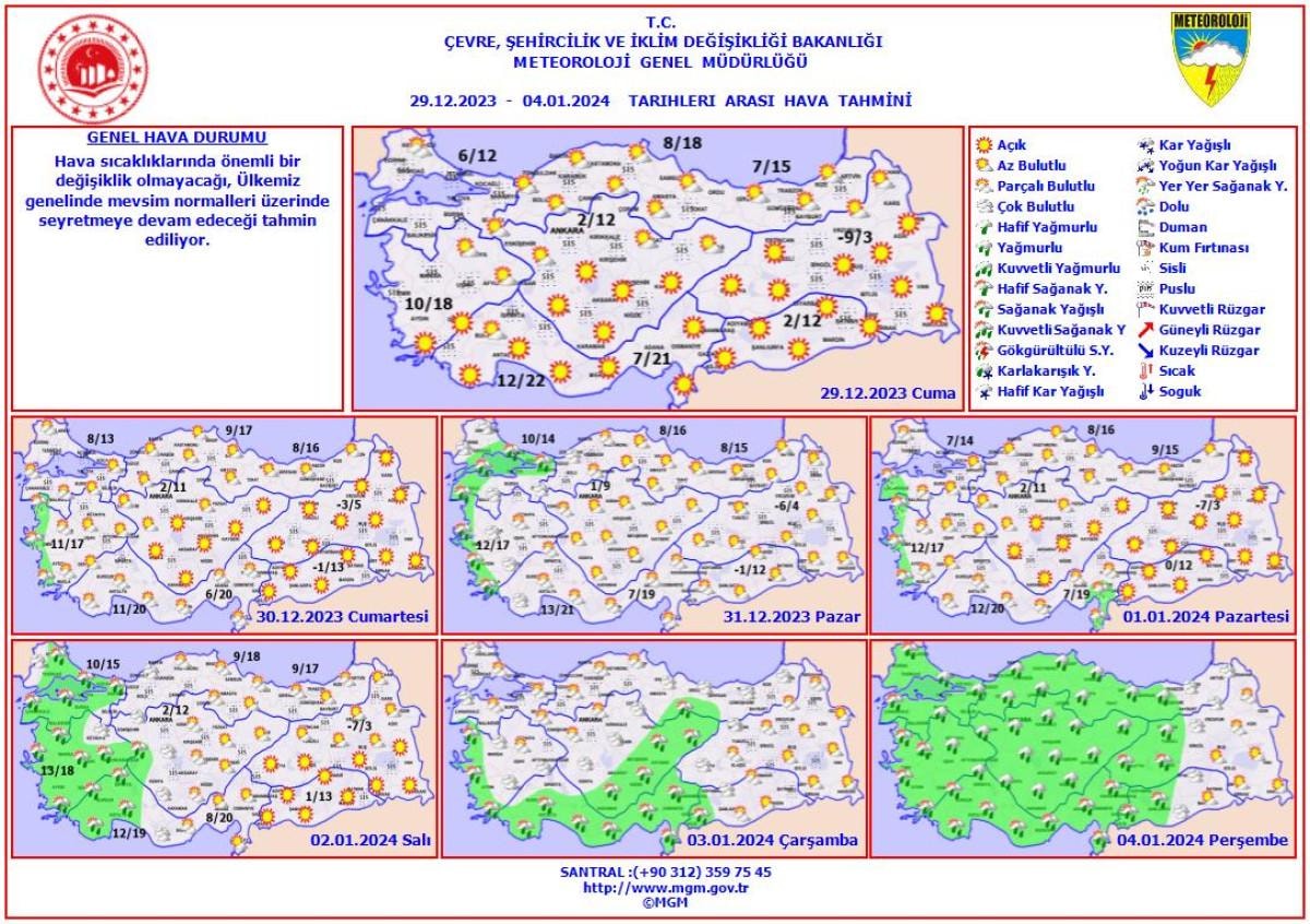 Meteoroloji, 29 Aralık 2023 ile 4 Ocak 2024 tarihlerini kapsayan haftalık tahmin haritasını yayınladı.