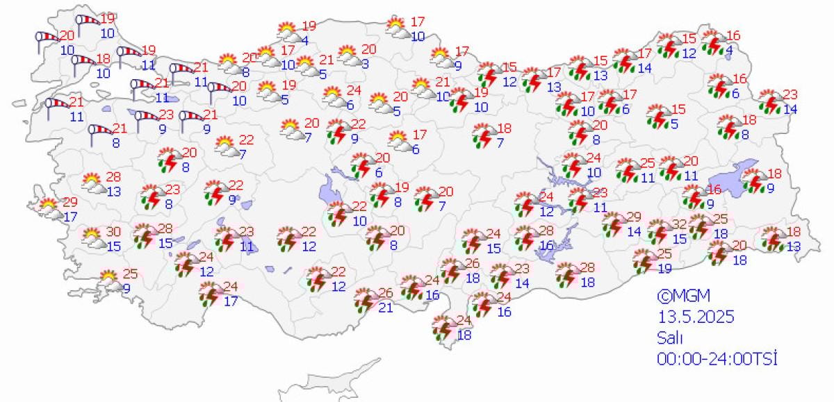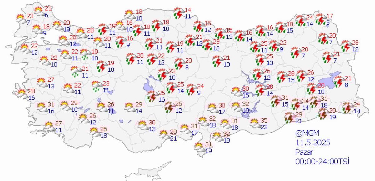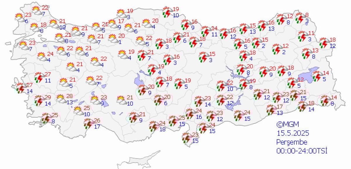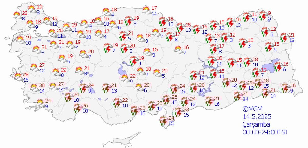 Meteoroloji Genel Müdürlüğü tarafından yapılan tahminlere göre; yurt genelinde parçalı ve çok bulutlu, Doğu Akdeniz’in Toroslar mevkii, İç Anadolu (Konya'nın güneyi ve Karaman hariç), Karadeniz, Doğu Anadolu, Güneydoğu Anadolu’nun doğusu ile Bilecik, Sakarya, Bursa'nın doğusu, Kütahya, Uşak, Afyonkarahisar, Adana ve Isparta çevrelerinin yerel olmak üzere aralıklı sağanak ve gök gürültülü sağanak yağışlı geçeceği tahmin ediliyor.