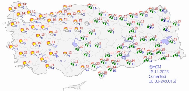 Meteoroloji Genel Müdürlüğü tarafından yapılan tahminlere göre yurt genelinin parçalı ve çok bulutlu, Marmara’nın doğusu, Doğu Akdeniz, İç Anadolu’nun doğusu, Karadeniz, Doğu Anadolu’nun kuzey ve batısı ile Güneydoğu Anadolu çevrelerinin yağmur ve sağanak yağışlı, Doğu Karadeniz’in iç kesimlerinin yüksekleri ile Doğu Anadolu’nun kuzey kesimlerinin yükseklerinin karla karışık yağmur ve yer yer kar yağışlı geçeceği tahmin ediliyor.