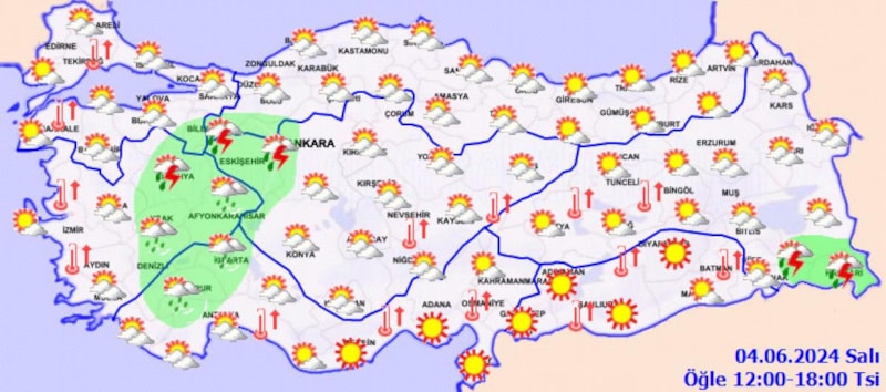 Öğleden sonra ve akşam saatlerinde Bilecik, Afyonkarahisar, Kütahya, Uşak, Denizli, Isparta, Burdur, Eskişehir ve Hakkari çevreleri ile Ankara'nın batısı ve Bolu'nun güney ilçelerinde yerel sağanak ve gök gürültülü sağanak yağışların görülmesi öngörülüyor.