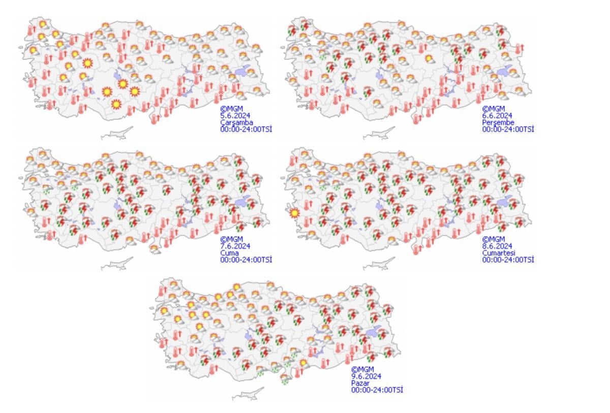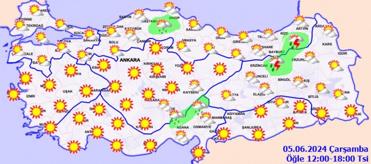 Meteoroloji Genel Müdürlüğü (MGM) tarafından yapılan son değerlendirmelere göre; öğle saatlerinde Kastamonu’nun doğusu, Sinop’un güneyi, Doğu Akdeniz’in Toroslar mevkii ile Erzurum'un kuzey ve batısı, Erzincan ve Bayburt'un doğusu ve Rize'nin iç kesimlerinin yerel sağanak ve gök gürültülü sağanak yağışlı geçeceği tahmin ediliyor.