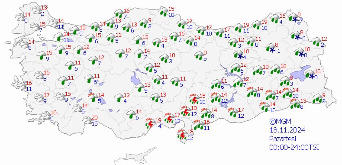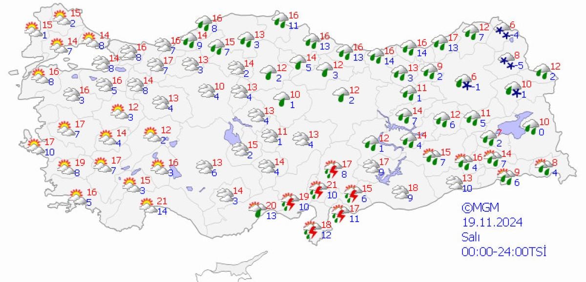 Bingöl, Hakkari, Tunceli, Şırnak, Bitlis ve Siirt'te yerel kuvvetli yağmur ve sağanak, yüksek kesimlerde karla karışık yağmur ve kar bekleniyor.