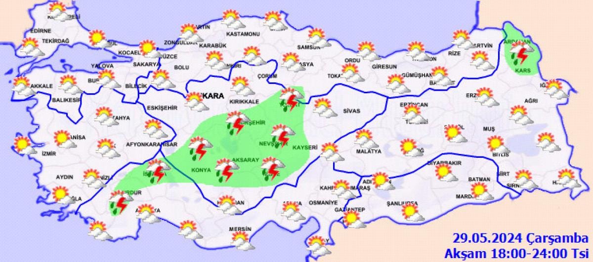 Yapılan son değerlendirmelere göre ise; ülkemiz genelinin parçalı yer yer çok bulutlu, Trakya Kesimi, Batı Akdeniz'in iç kesimleri ile Toroslar Mevkii, İç Anadolu (Eskişehir dışında), Orta Karadeniz, Kastamonu, Artvin, Ardahan, Kars ve Hakkari çevreleri ile Rize ve Trabzon'un iç kesimlerinin yerel sağanak ve gök gürültülü sağanak yağışlı geçeceği tahmin ediliyor.