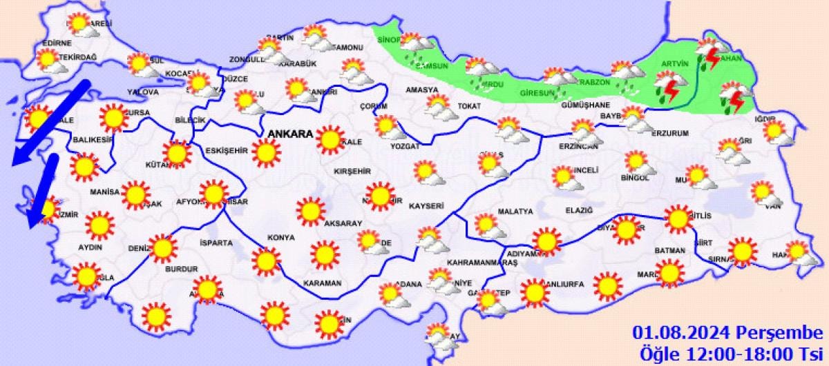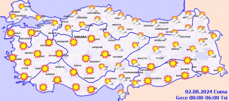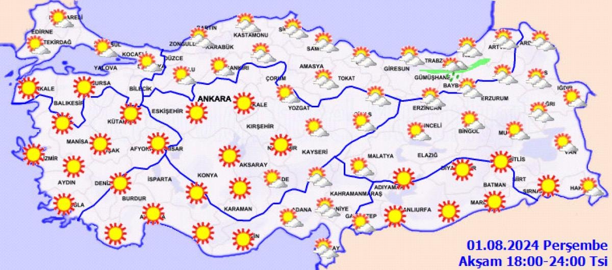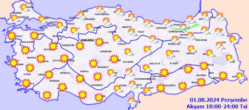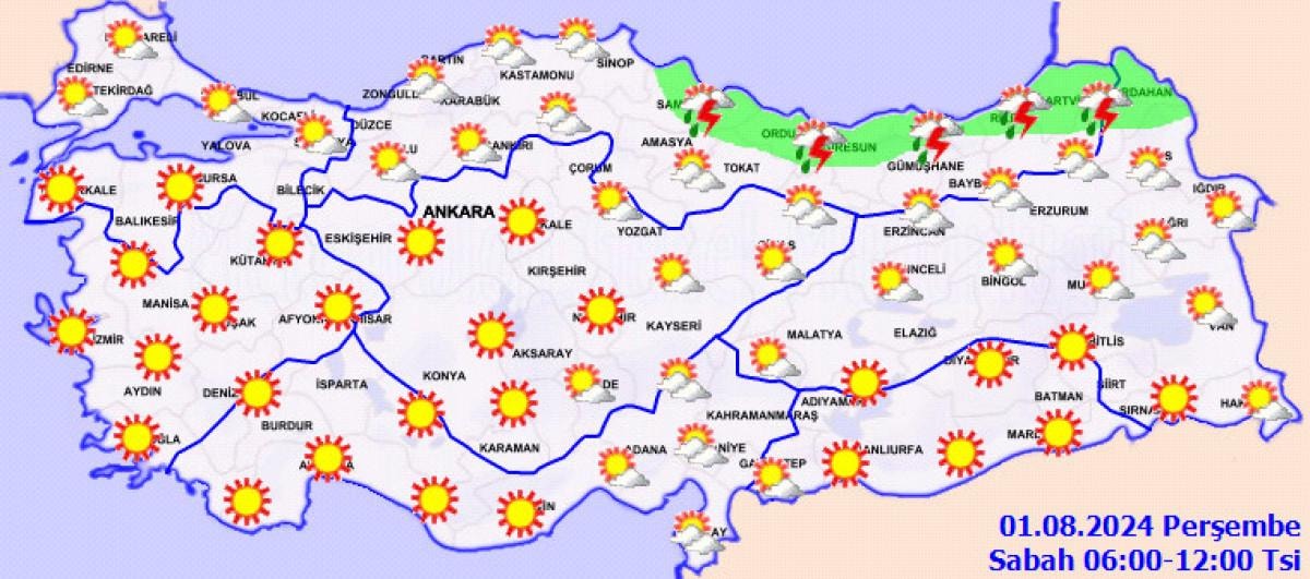 Yapılan açıklamada; "Ülkemizin kuzey kesimleri parçalı yer yer çok bulutlu, Orta ve Doğu Karadeniz kıyıları ile Artvin, Kars ve Ardahan çevrelerinin yerel sağanak ve gök gürültülü sağanak yağışlı, diğer yerlerin az bulutlu ve açık geçeceği tahmin ediliyor." ifadesi yer aldı.