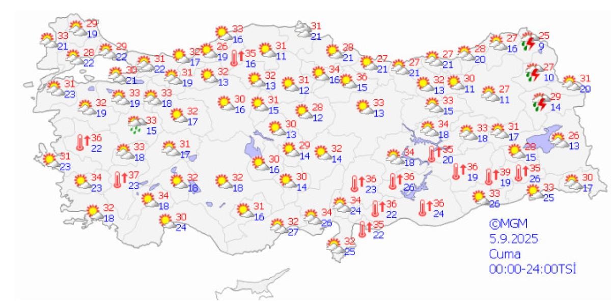 En yüksek sıcaklarda İstanbul'da, Ankara'da 29-30 derece civarında olacak. İzmir'de ise çoğunlukla az bulutlu açık bir hava var. İzmir'deki en yüksek sıcaklarda bu hafta 34-35 derece bandında serilecek.