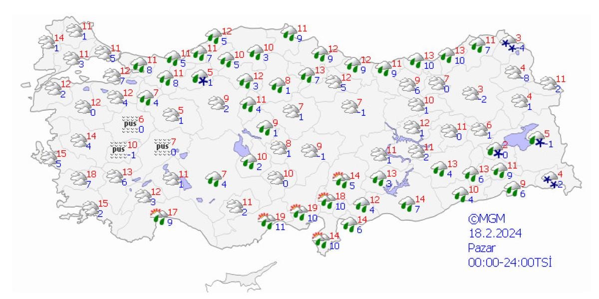 Yapılan son değerlendirmelere göre; yurt genelinin parçalı ve çok bulutlu, Marmara, Orta ve Doğu Akdeniz, İç Anadolu’nun güneydoğusu, Batı Karadeniz, Orta ve Doğu Karadeniz kıyıları, Doğu Anadolu'nun güneyi, Güneydoğu Anadolu, Muğla, Artvin, Erzurum ve Iğdır çevreleri ile Antalya’nın batı ilçelerinin yağışlı geçeceği tahmin ediliyor.