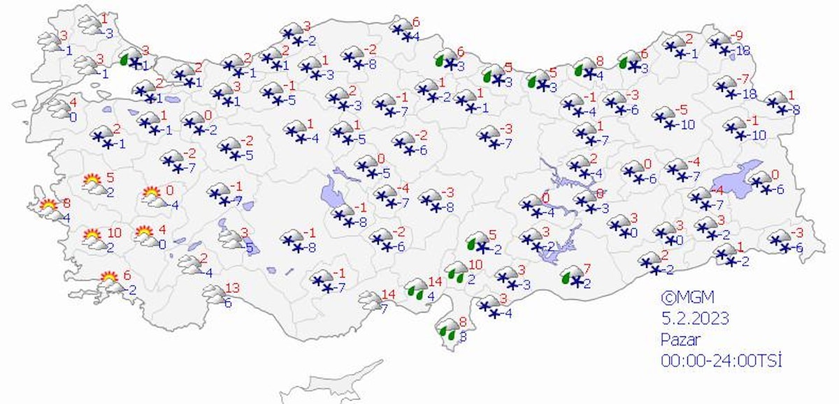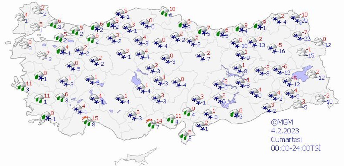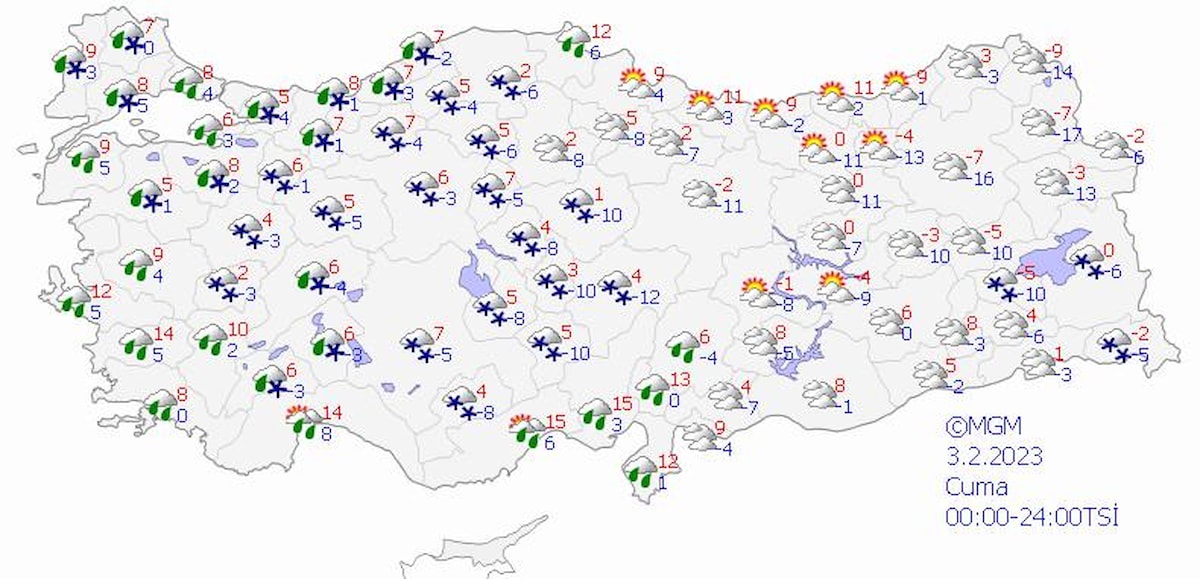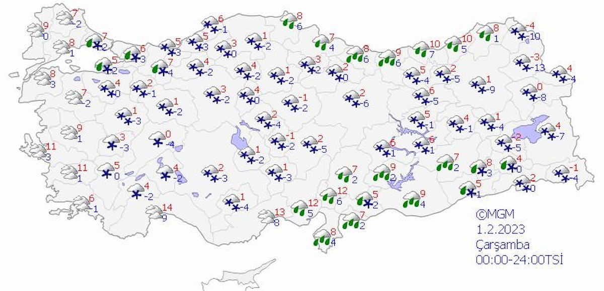 Ülkemiz genelinin çok bulutlu, Marmara'nın doğusu, İç Ege, (Antalya hariç) Akdeniz, İç Anadolu, Karadeniz ile Doğu ve Güneydoğu Anadolu Bölgeleri'nin yağışlı geçeceği tahmin ediliyor. Yağışların, Orta ve Doğu Karadeniz kıyıları, Akdeniz kıyıları ve Güneydoğu Anadolu'da yağmur ve sağanak, diğer yerlerde karla karışık yağmur ve kar şeklinde görülmesi; Doğu Akdeniz'in doğusu, (Batman hariç) Güneydoğu Anadolu, Şırnak, Hakkari, Elazığ, Bingöl, Ordu ve Giresun çevrelerinde ise yer yer kuvvetli ve yoğun olması bekleniyor. Yağışların Hatay, Kahramanmaraş, Osmaniye, Gaziantep, Kilis, Şanlıurfa, Adıyaman, Mardin, Siirt, Şırnak, Hakkari, Diyarbakır, Elazığ, Bingöl, Ordu ve Giresun çevrelerinde kuvvetli ve yoğun olması beklendiğinden yaşanabilecek olumsuzluklara karşı dikkatli ve tedbirli olunmalıdır. Rüzgarın Akdeniz Bölgesi'nde kuzey, kuzeybatı; Doğu Anadolu'nun güneydoğusunda güneybatı yönlerden yer yer kuvvetli (30-60 km/sa) esmesi beklendiğinden yaşanabilecek olumsuzluklara karşı dikkatli ve tedbirli olunmalıdır.