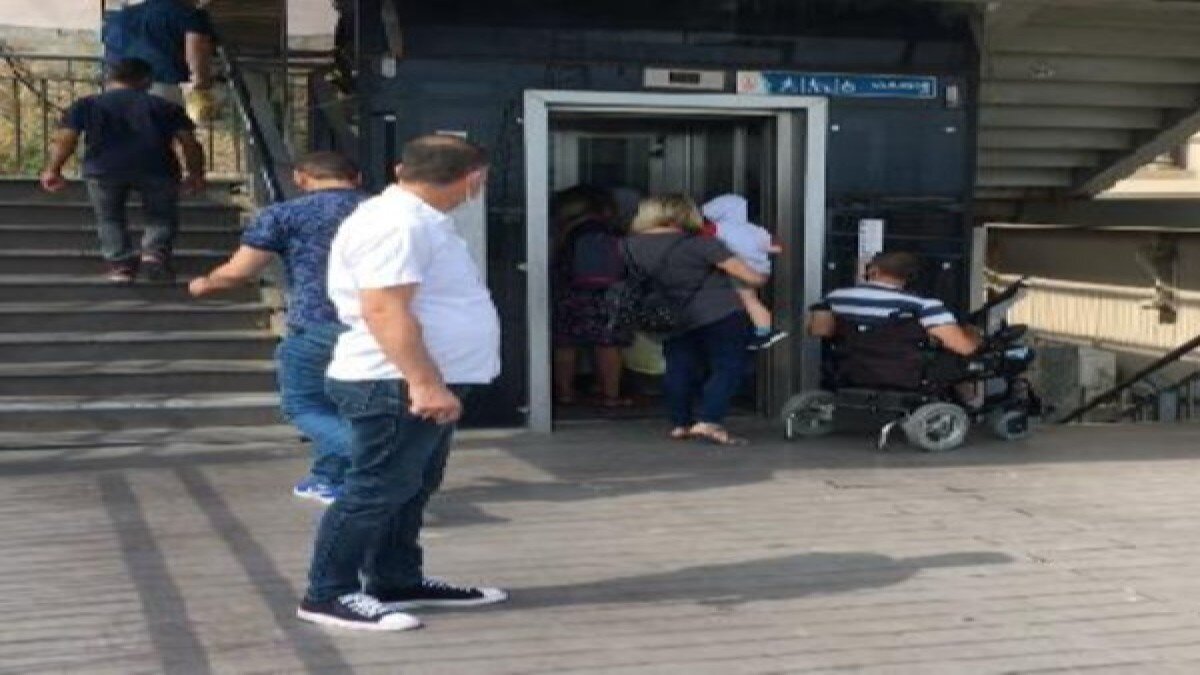 Dün akşam saatlerinde yürüme engelli bir kişi, akülü arabasıyla asansöre binmek istedi. Asansöre yönelen engelli vatandaş, içerideki insanların asansörden inmemesi nedeniyle akülü aracıyla asansörden inmek zorunda kaldı.