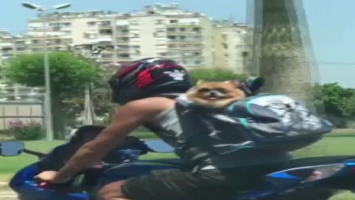 Antalya Kepez'de motosikletli bir sürücünün sırt çantasındaki köpek, trafiktekilerin dikkatini çekti.