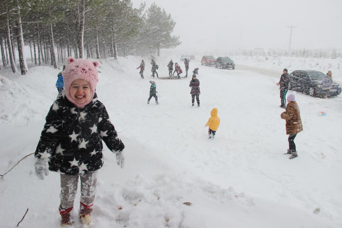 Özellikle çocuklar, yağan kar altında kar topu oynarken, Yılanlı yolunun geliş ve gidiş yönü tamamen araçlar ile doldu.