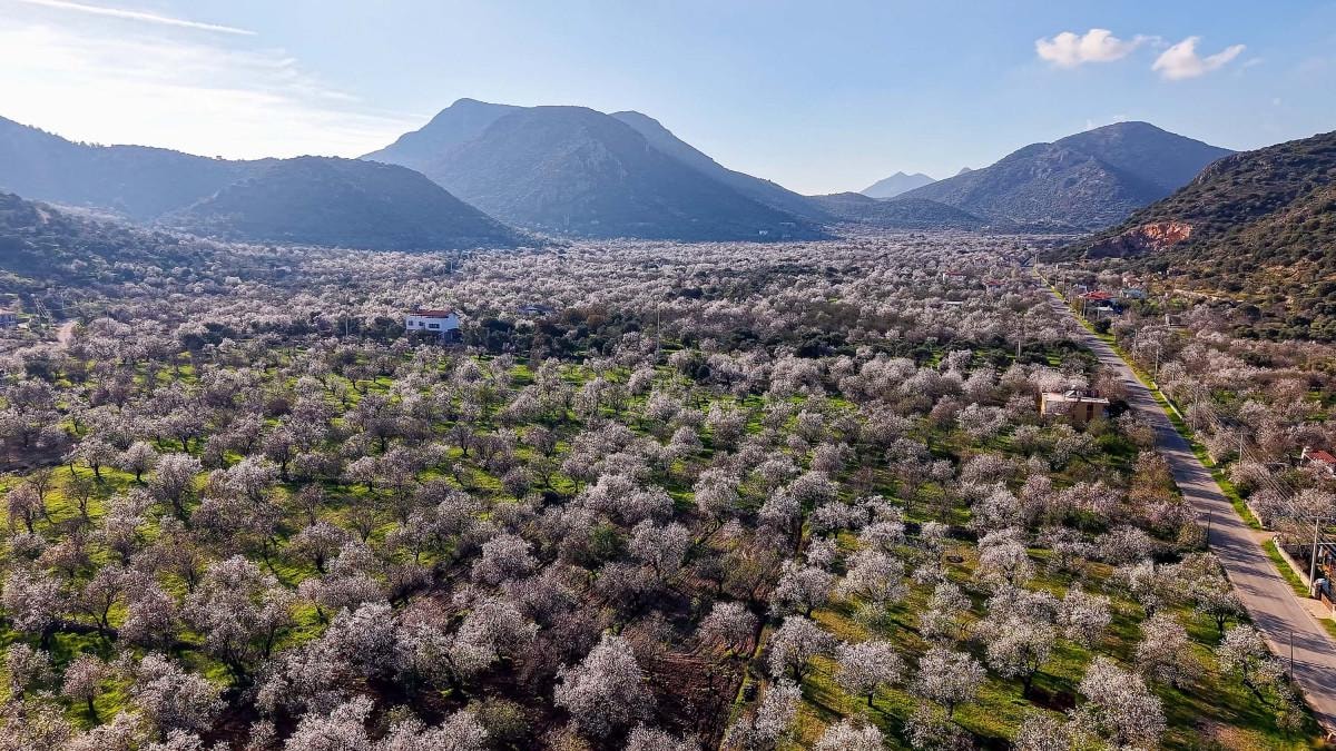 Türkiye'nin bazı bölgelerinde kar yağışı ve soğuk havanın etkisinin sürdürdüğü bugünlerde baharın habercisi olarak kabul edilen ve her sene şubat ayında çiçek açan badem ağaçları, drone ile havadan görüntüledi.