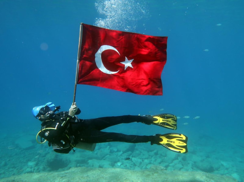 Muğla'nın Fethiye ilçesinde dalgıçlar, 30 Ağustos Zafer Bayramı dolayısıyla deniz dibinde Türk bayrağı açtı.