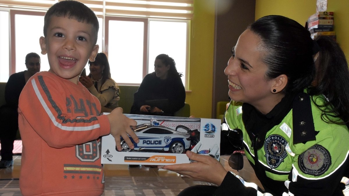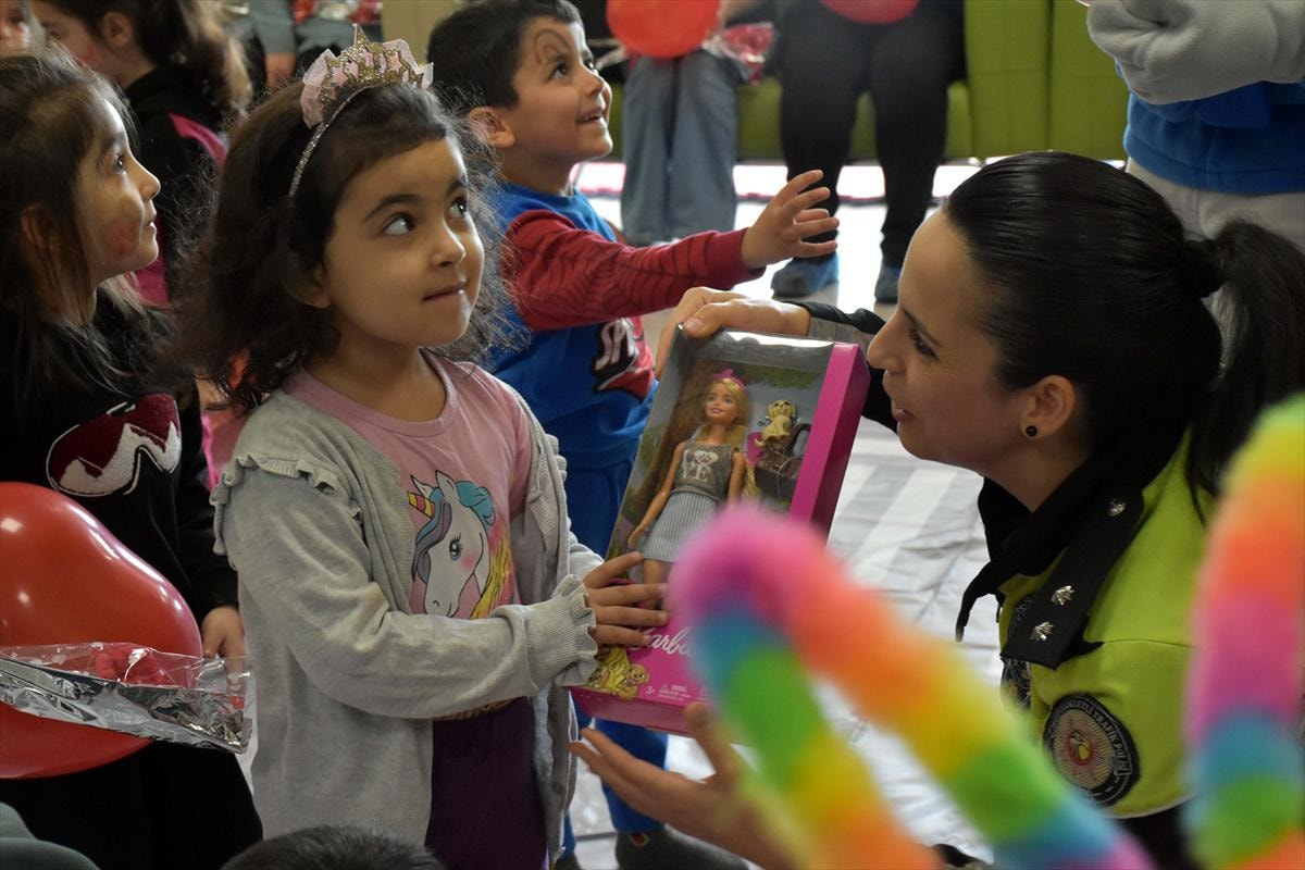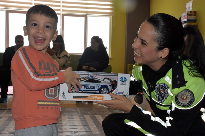 Etkinlik sonrasında erkek çocuklara balon, uzaktan kumandalı oyuncak polis arabası, kızlara da bebek hediye eden trafik ekipleri, depremzede miniklerin yüzünü güldürdü.