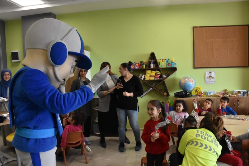 Kredi Yurtlar Kurumu'na bağlı Turgut Reis Erkek ve Kız Öğrenci Yurdu'ndaki anasınıfında eğitim gören depremzede öğrencilerle buluşan ekipler, trafik kurallarına ilişkin çizgi film gösterimi yaptı.