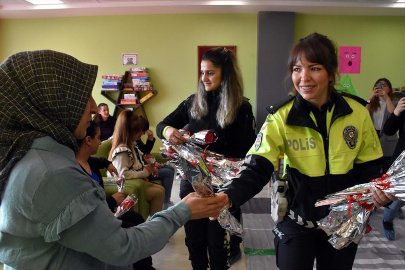 Ekipler, depremin ardından bölgeye gelen afetzede kadınlara da "geçmiş olsun" dileğinde bulunarak, 8 Mart Dünya Kadınlar Günü dolayısıyla karanfil verdi.