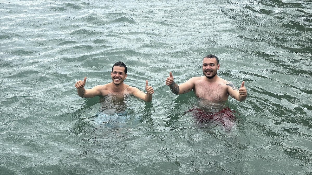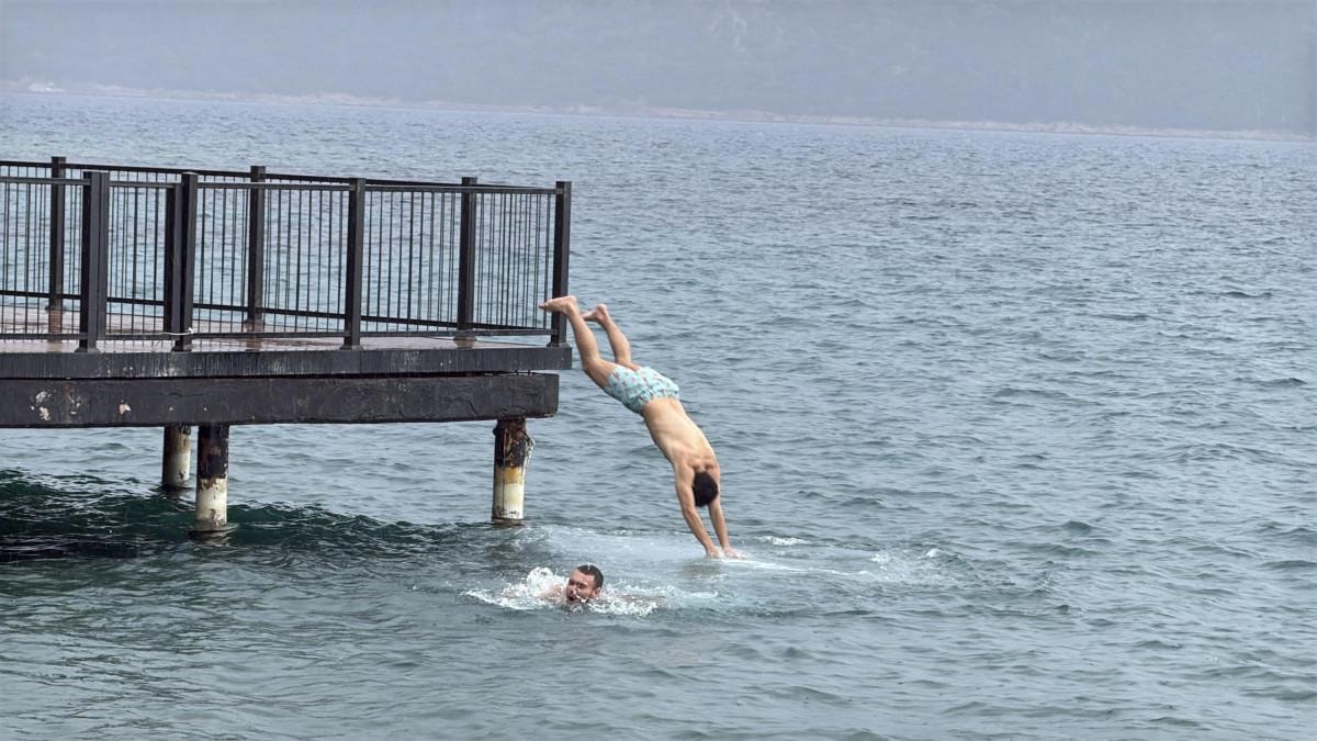 Doğancan Akyel ile Enes Türker, İçmeler Sahili'nde kuvvetli sağanağa rağmen iskeleden suya atlayarak denize girdi.