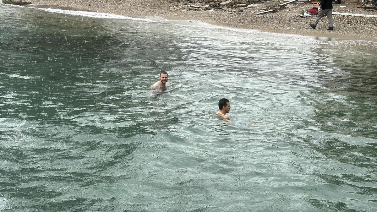 Yaklaşık 15 dakika kuvvetli sağanak altında denizde yüzen Akyel ve Türker, daha sonra sudan çıkarak plajdan ayrıldı.