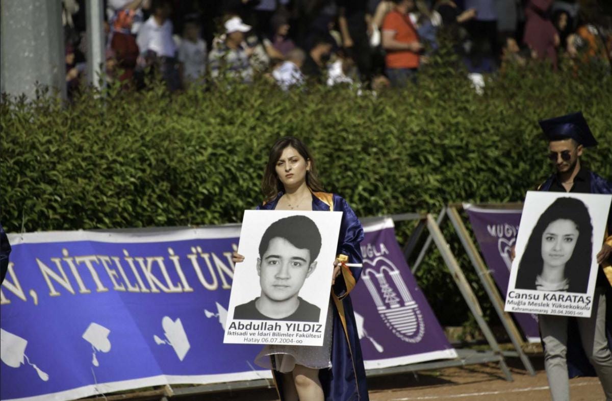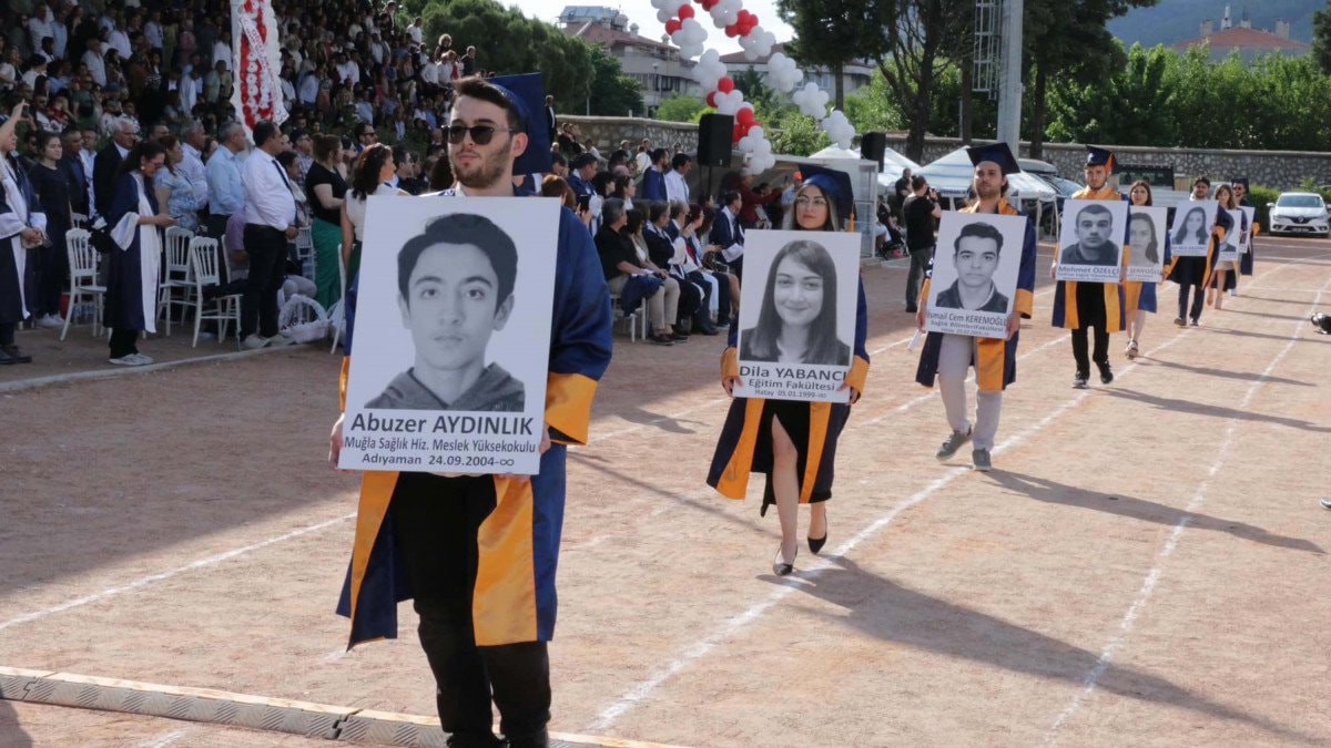 Atatürk Stadyumu'ndaki programın açılışında, selamlama yürüyüşüne katılan öğrenciler, Kahramanmaraş merkezli depremlerde hayatını kaybeden arkadaşları Furkan Çelik, Demet Koku, Hediye Şerifoğlu, Abuzer Aydınlık, Ekin Mira Kazancı, Cansu Karataş, Mehmet Altunay, Dila Yabancı, Emre Şen, Mehmet Özelçi, Tanya Eskiocak ve İsmail Cem Keremoğlu'nun fotoğraflarını taşıdı.