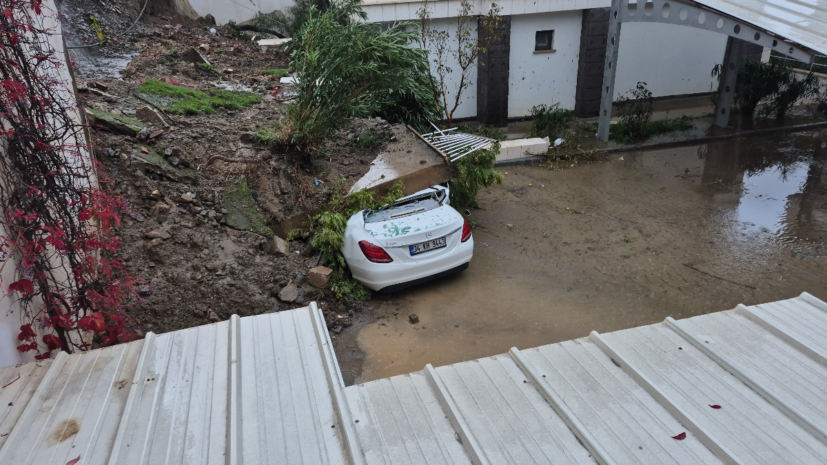 Bodrum ilçesinde bağlı Şalvarağa mevkiindeki bir sitenin istinat duvarı, yağışın etkisiyle çöktü.