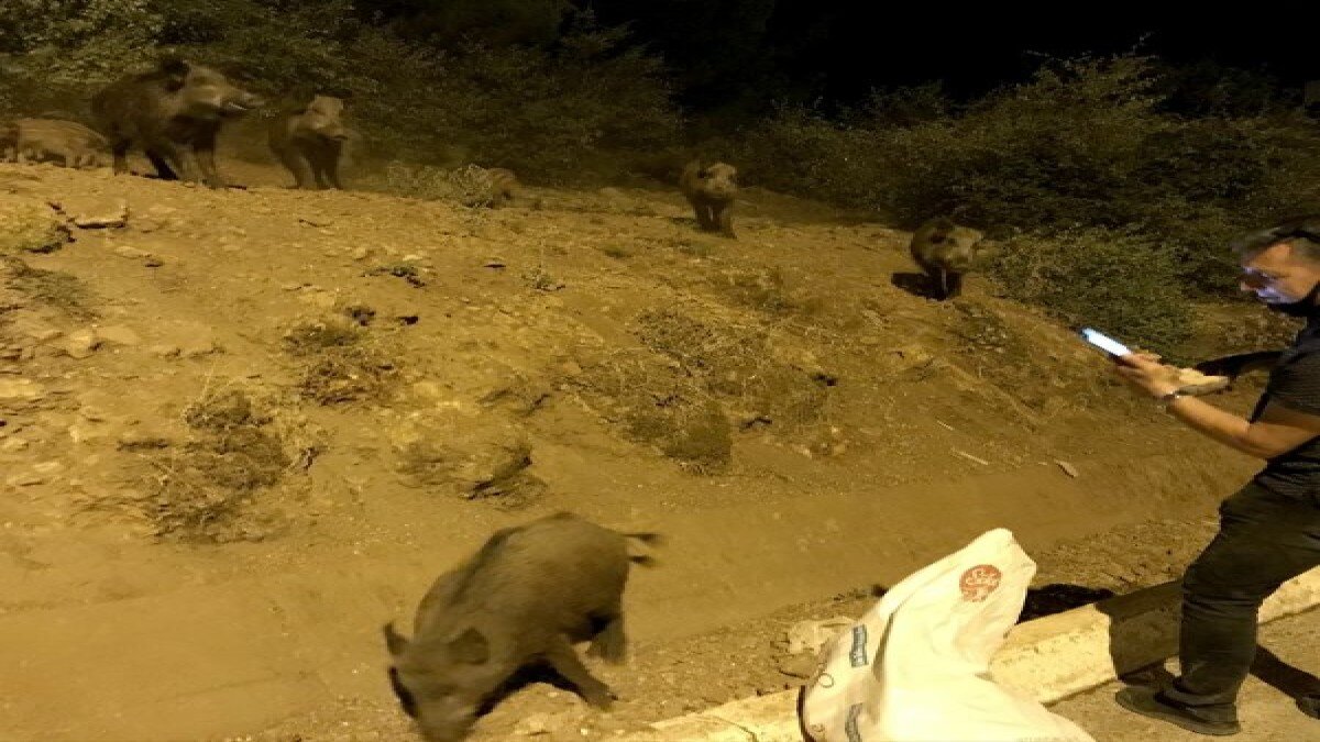 Yaklaşık 10 domuzun bulunduğu sürünün her gece aynı noktaya indiği ve yiyecek aradığı ifade edildi.