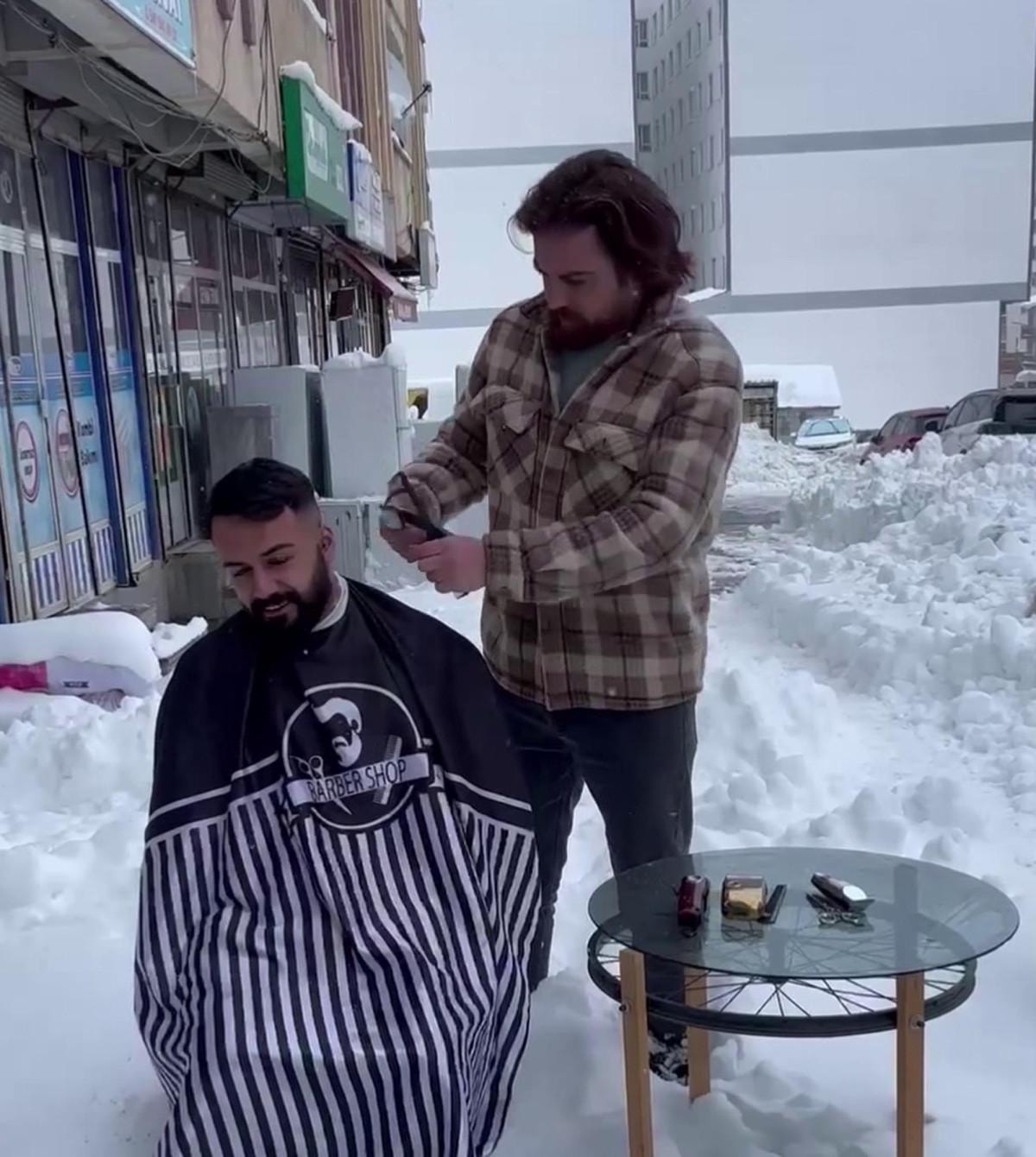 Kar yağışı ve soğuğa aldırmayan Kaya, müşterilerini açık havada tıraş etmeye başladı.
