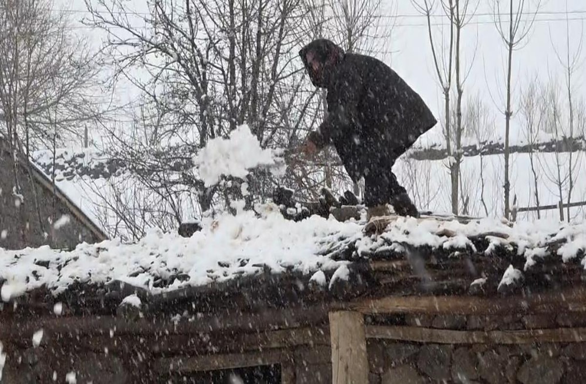 Gördüğünüz gibi nisan ayında kar yağıyor. Birkaç yılda bir nisan ayında kar yağıyor. Bahar geldi diye hayvanlarımızı meralara çıkardık. Meralarda otlattık, tekrar kar yağınca hayvanlarımızı ahırlara geri getirdik, ot ve saman veriyoruz. Kar biriken damları küreklerle temizliyoruz ki ahırdaki hayvanlara sızan su zarar vermesin.
