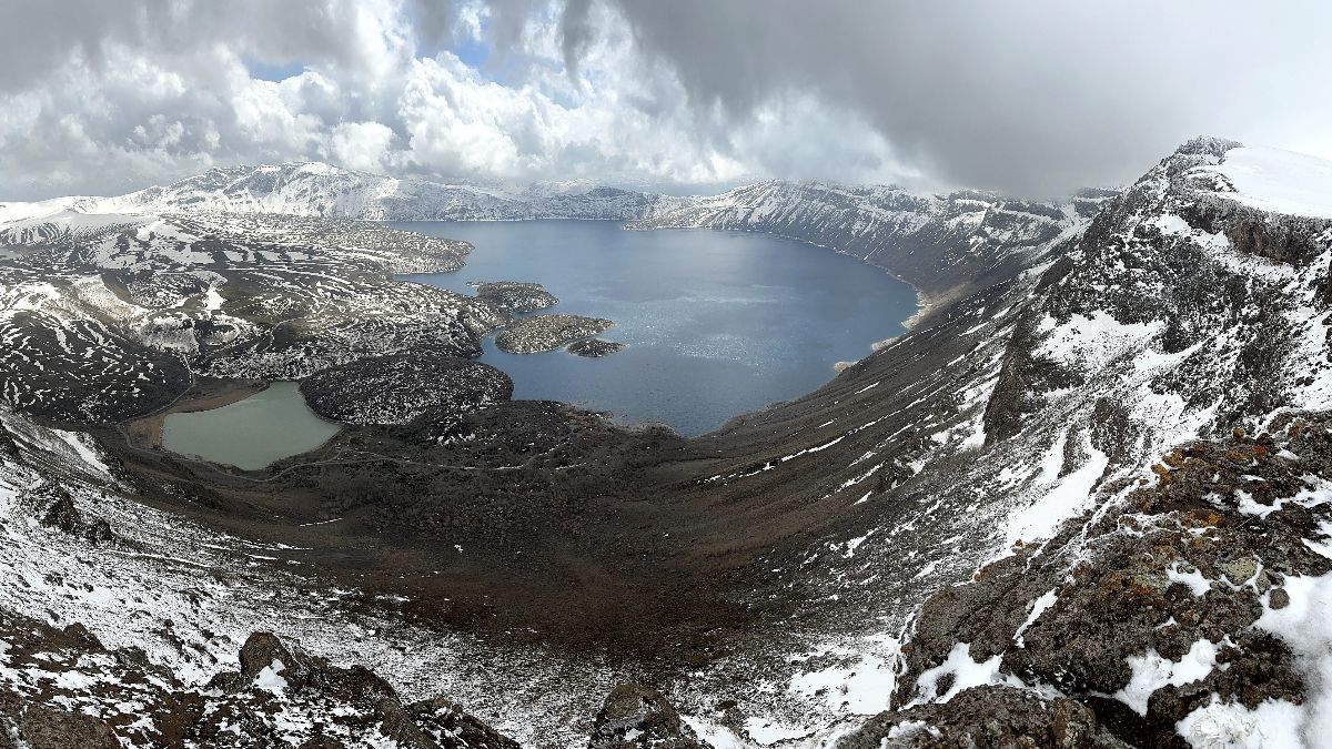 Bugün çok güzel bir manzaraya eşlik ediyoruz. Yaklaşık 5 saatlik bir yürüyüş sonucunda kara bata çıka buraya kadar geldik. Zor bir süreçti ama geldiğimiz yere ve sonuca baktığımızda gerçekten çok güzel bir manzarayla karşı karşıyayız. Biz buraya genelde yazın geliyoruz ama kış mevsiminde ilk defa geldik. Arkamızda büyük bir göl var. Bir tatlı su gölü. Bunun yanında daha küçük bir göl de var, sıcak su kaynakları var. Dünyanın ikinci büyük krater gölü burası.